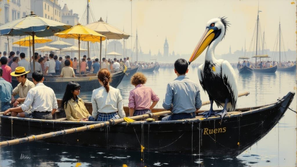 This hyperdetailed concept art features a crowded rowing boat with a pelican perched on the bow. Rendered with dynamic and volumetric lighting for a striking splash art effect.
