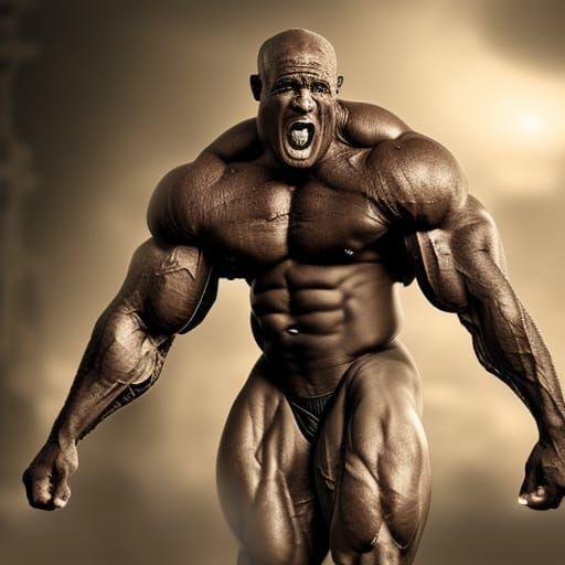 This image shows a muscular monster bodybuilder. The digital matte painting features dramatic lighting and intricate details in a maximalist style.