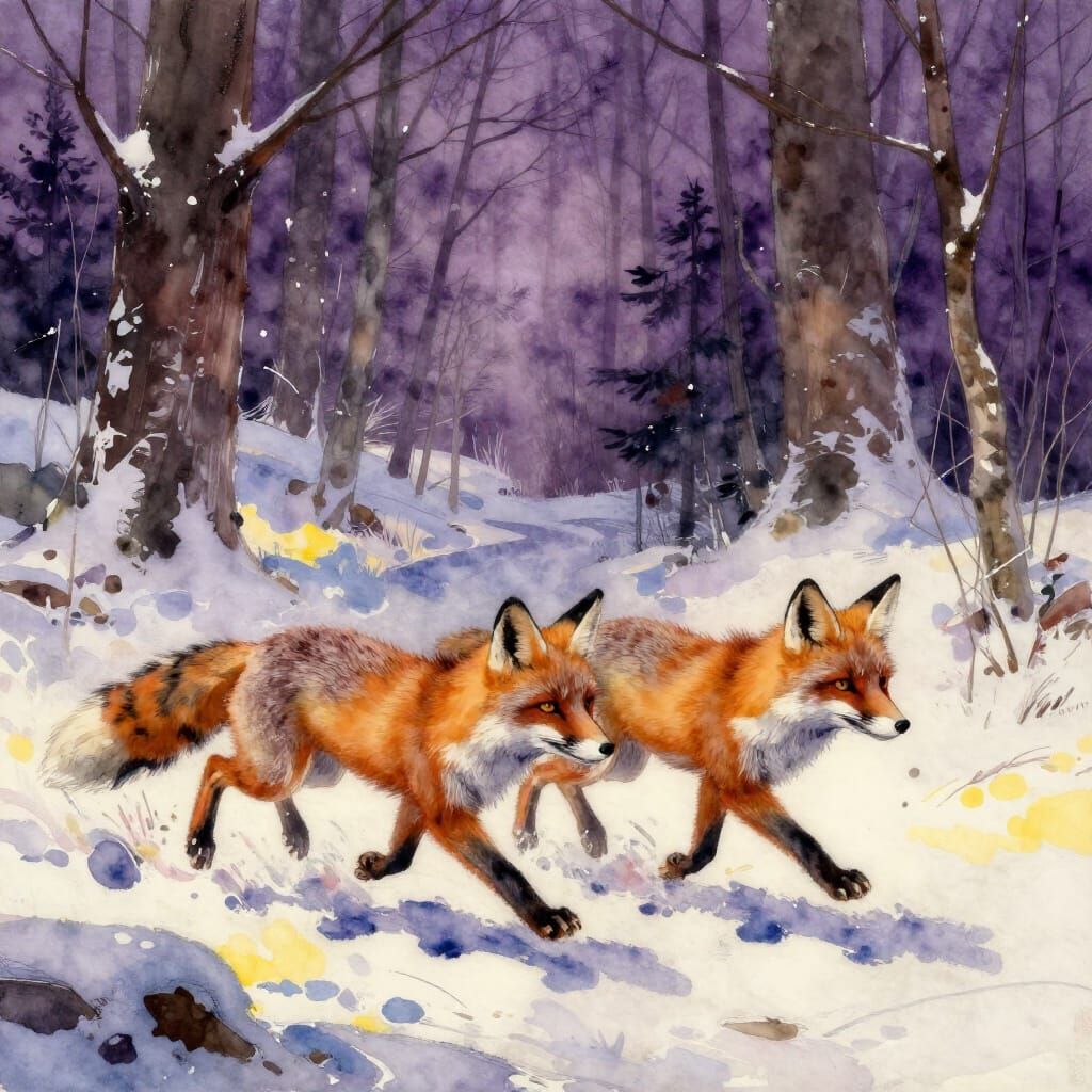 This image captures two foxes in a snowy forest, rendered with expressive watercolor techniques and dynamic lighting. Featuring deep purples and yellows, it evokes dark fantasy concept art.