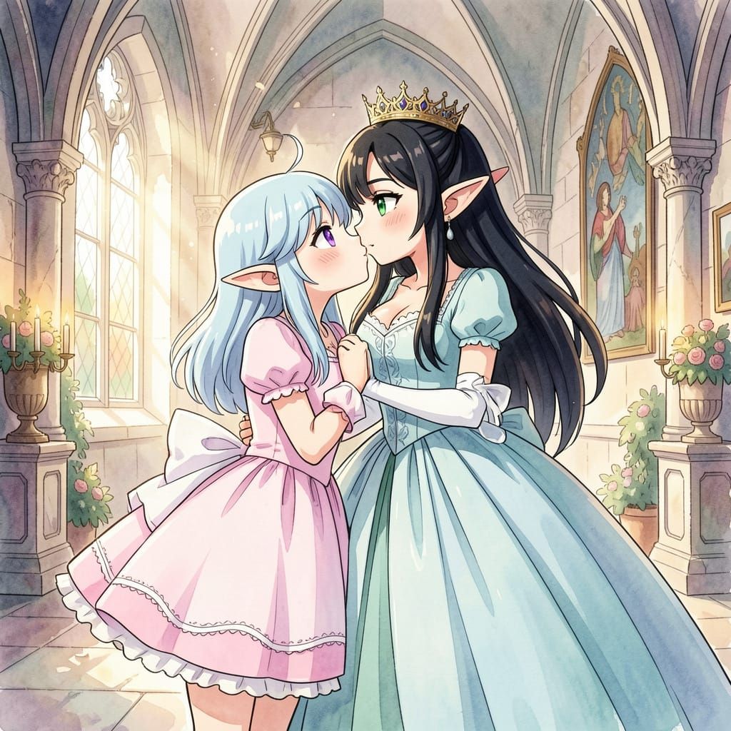 This image shows two female elves sharing a kiss in a fantasy castle, rendered in a vibrant watercolor and anime style with cel-shaded details.