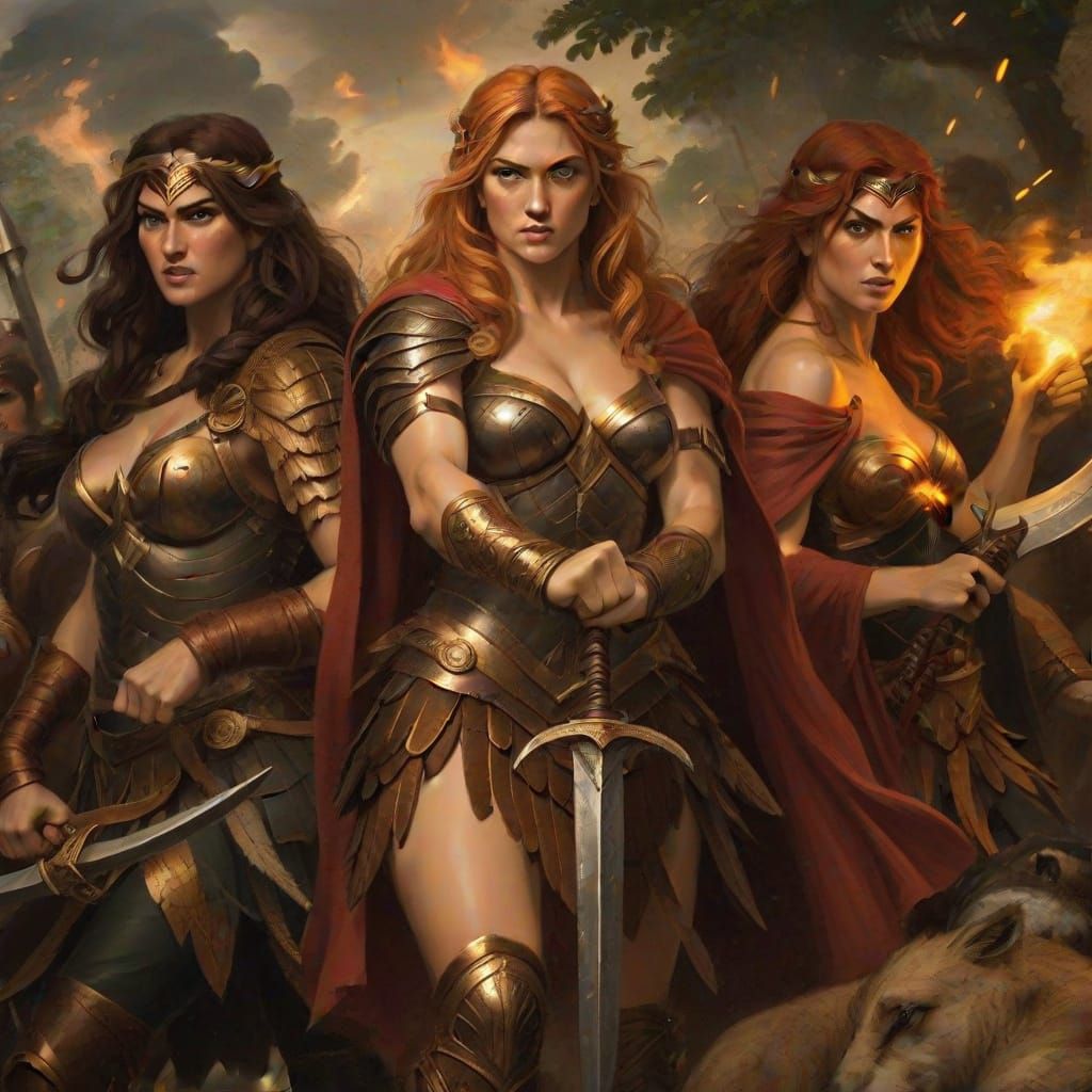 Generate unique images of powerful amazons fighting. Free and easy AI art creation.
