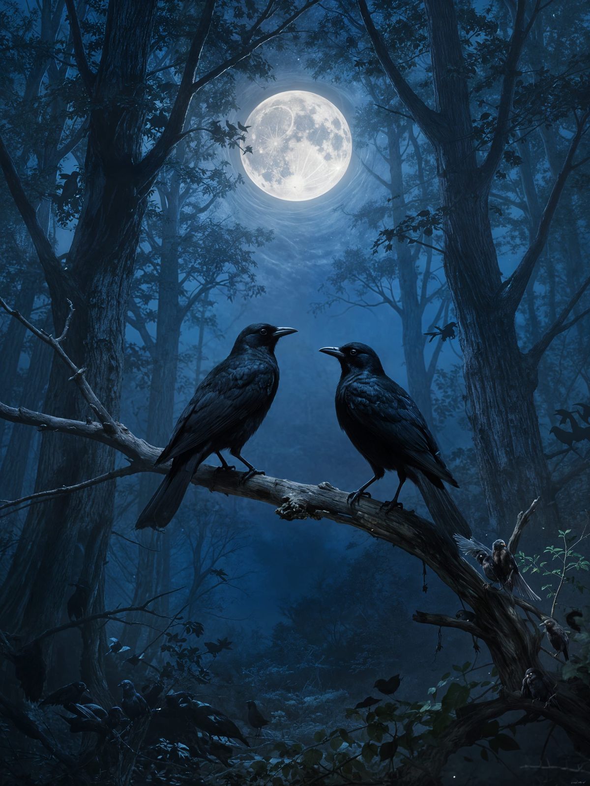 This image shows two black birds perched on a dry tree branch in a midnight blue forest, illuminated by a bright full moon. It is rendered in a dreamy, ethereal dark fantasy painting style.