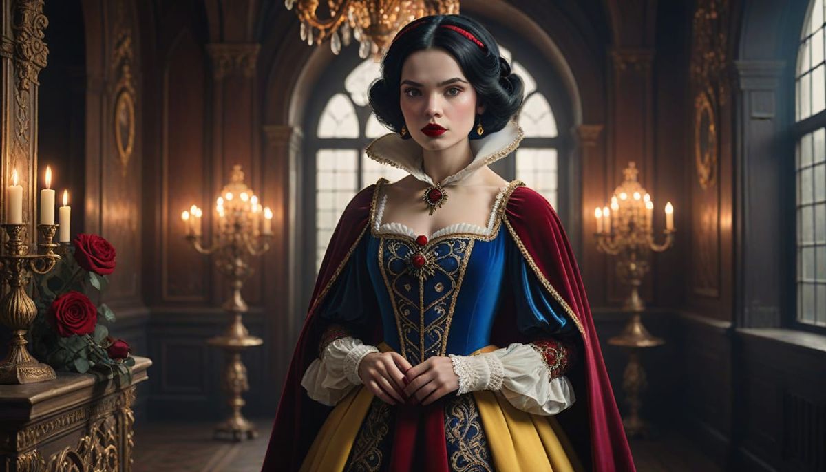 This image showcases Snow White in a stunning dark fantasy portrait, surrounded by opulent details and rich textures, with a warm, muted color palette and softbox lighting.