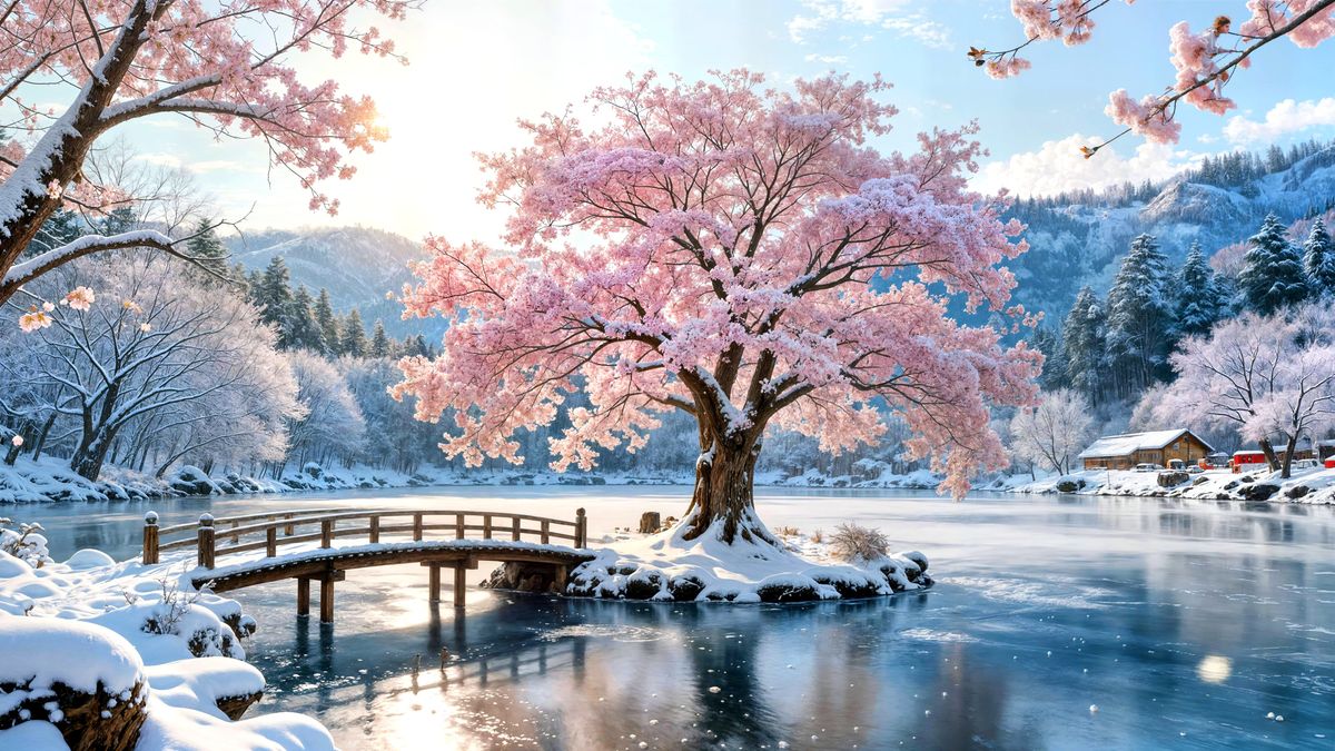 A hyper-detailed fantasy painting of a Japanese rural scene. Features a blooming sakura tree, snow-covered woods, a frozen lake with a bridge, and falling snow illuminated by a golden sun.