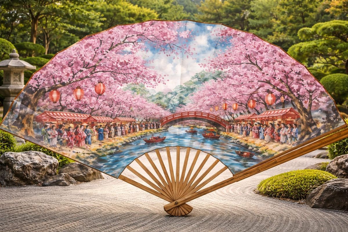 An intricately painted Japanese ōgi, using ink and watercolours, showing a scene of the Sakura Matsuri in beautiful vibrant colours. The background is a Zen garden scene.