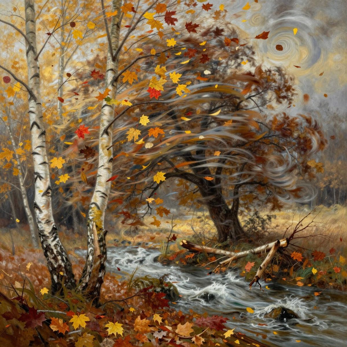 This romantic landscape painting captures a fierce autumn storm with dramatic atmosphere and sublime nature, featuring slender birch trees bending and leaves swirling in a vibrant maelstrom of color.