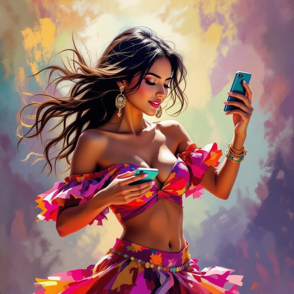 This image shows a woman energetically dancing Peruvian Cumbia while holding her phone. Rendered as a vibrant digital painting with bold colors and dynamic brushstrokes.