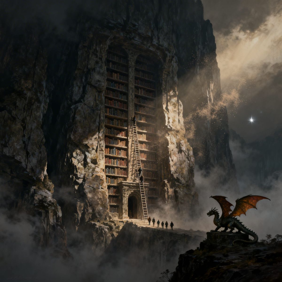 This image depicts a colossal, ancient library carved into a misty cliff, featuring towering rock bookshelves. Figures climb ladders while a dragon statue guards the entrance, illuminated by dramatic lighting and a distant star.