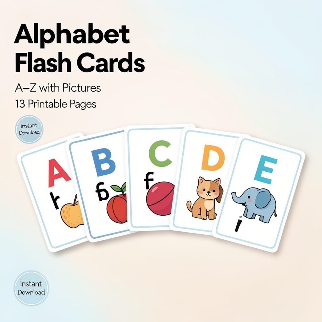 This professional mockup showcases printable A-Z alphabet flash cards with cute, simple illustrations. Designed in a flat vector style with soft, preschool-friendly colors, ideal for educational products.