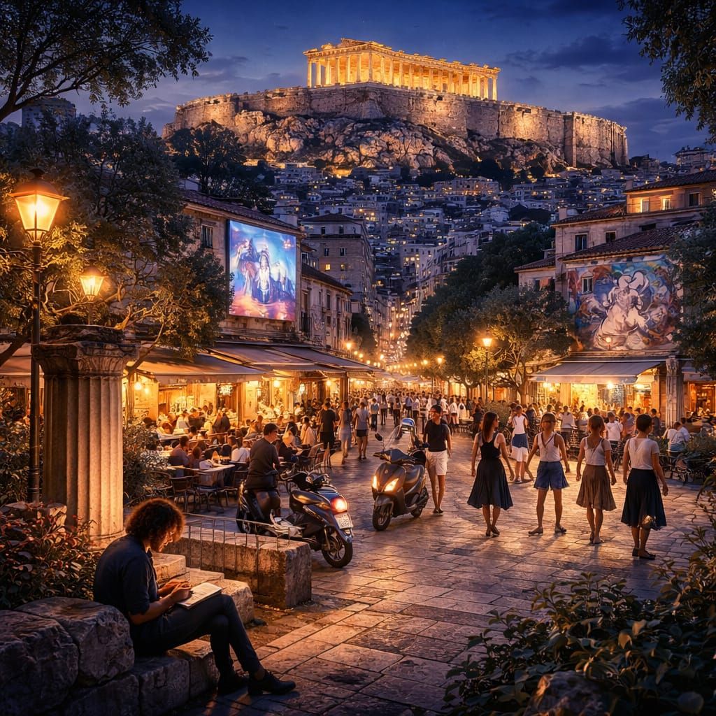 This image captures Athens at dusk, with the Acropolis illuminated above a vibrant cityscape. Ancient myths and modern life merge in a luminous, harmonious urban scene.