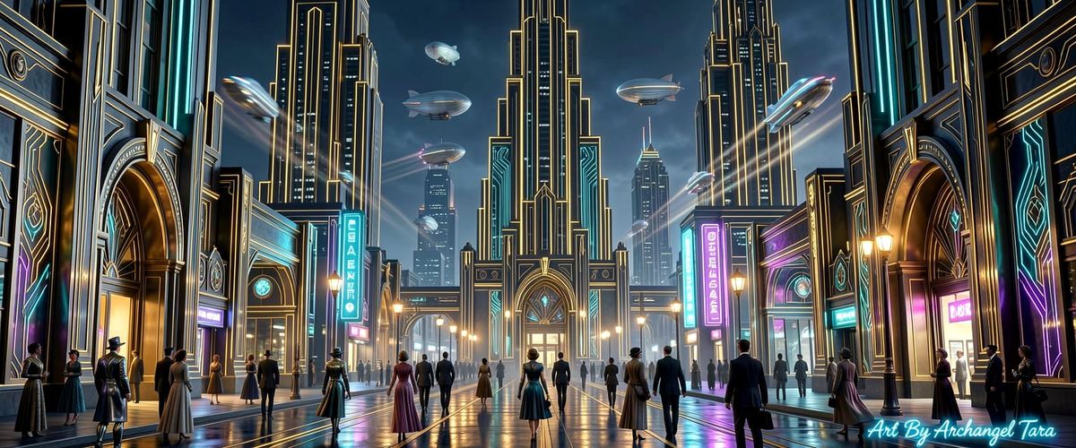 Tysvm CaylaCatz please visit her work this was her idea and I love how it turned out. 3/31/2026-Ultra-detailed Decopunk cityscape at night, blending Art Deco elegance with retro-futuristic technology. Towering skyscrapers rise with slee...Art By Archangel Tara