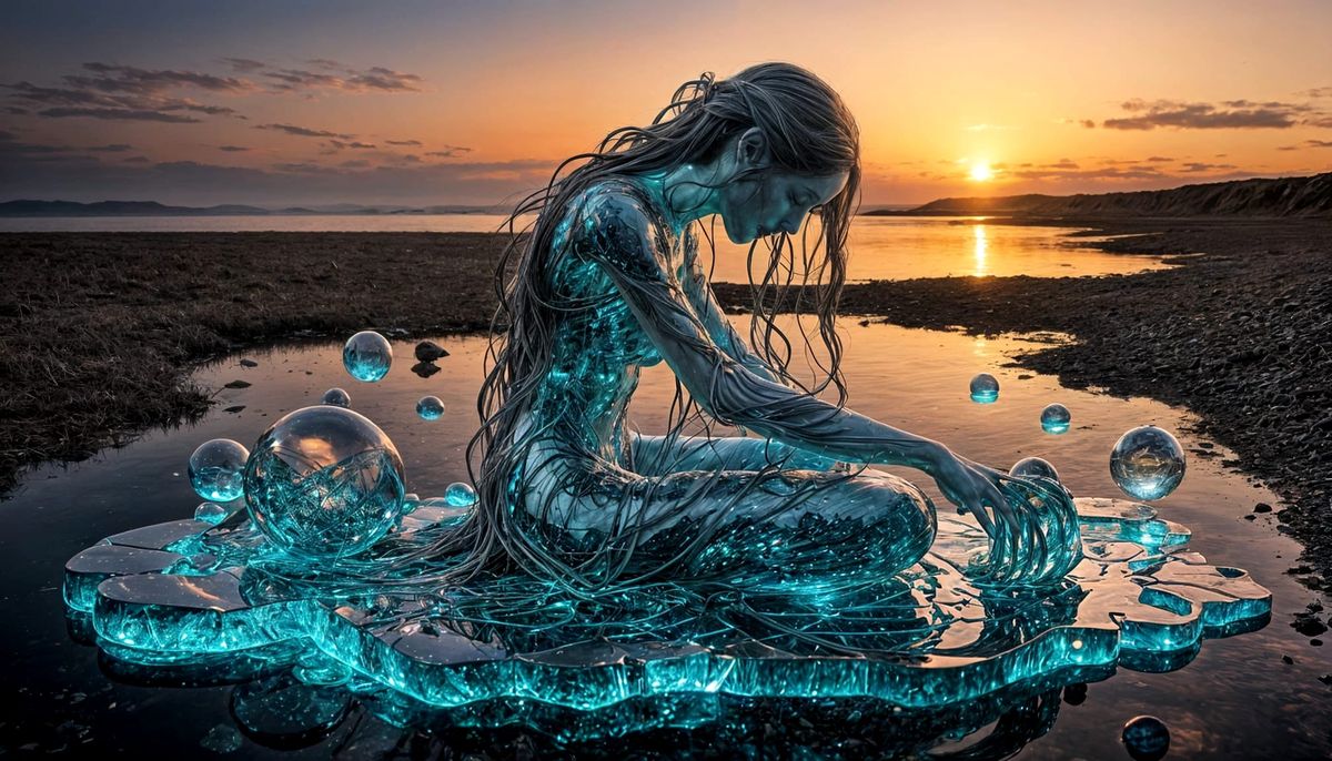 This image shows a surreal, fragmented sculpture of a woman with flowing hair by a sunset. It incorporates bio art elements, glowing creatures, and abstract designs, evoking resilience and authenticity.