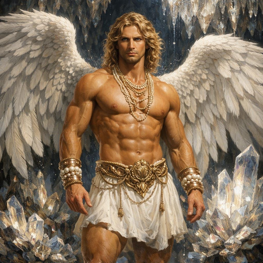 This detailed painting shows a muscular, winged man in a white skirt and gold accessories standing within a sparkling crystal cave. The artwork features dramatic lighting.