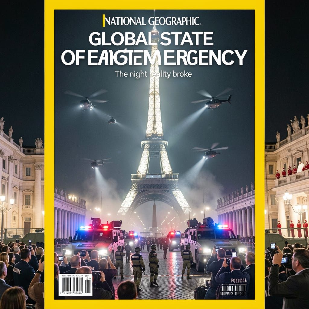 This photorealistic magazine cover depicts a global emergency as the Eiffel Tower replaces St. Peter's Basilica. Military and police secure the Vatican while news crews capture the unprecedented event.