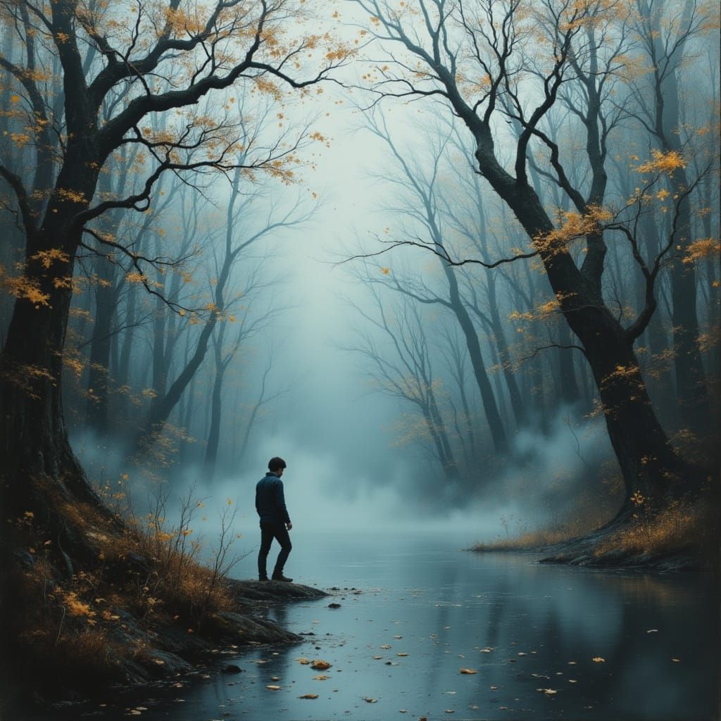 This image shows figures made of swirling mist rising from a misty lake within an enchanted forest. Rendered in a hyperrealistic oil painting style with dramatic lighting and a dark color palette.