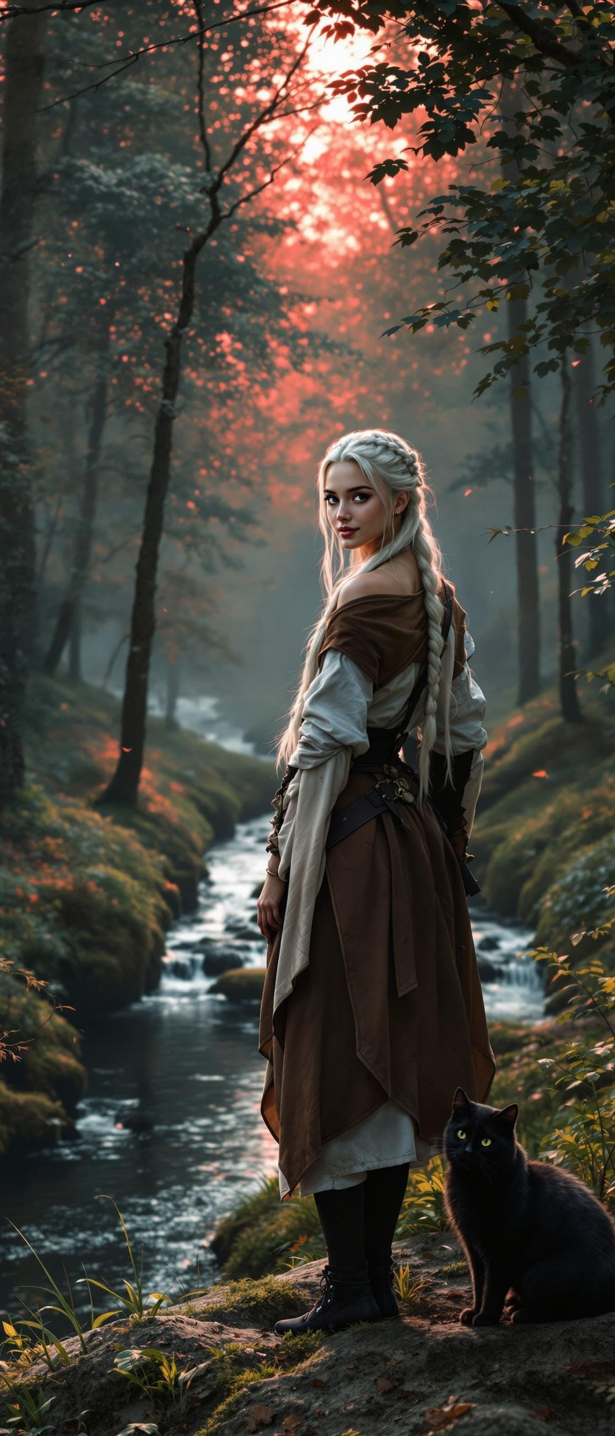 A hyperrealistic image of a white-haired witch in medieval attire, with a black cat, standing in a serene forest at sunrise. Cinematic lighting and atmospheric effects create a moody, high-contrast scene.