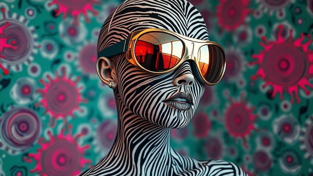This image depicts a woman made of swirling stripes in a detailed room with fingerprint wallpaper and splash paint. Features cinematic lighting and a surreal, dreamlike aesthetic.