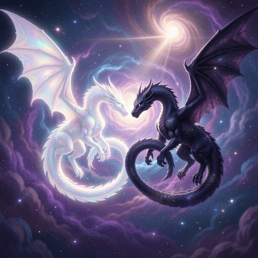 This image shows a celestial light dragon and an obsidian dark dragon flying together, their tails forming a heart. Rendered in a digital matte painting style with cosmic colors.