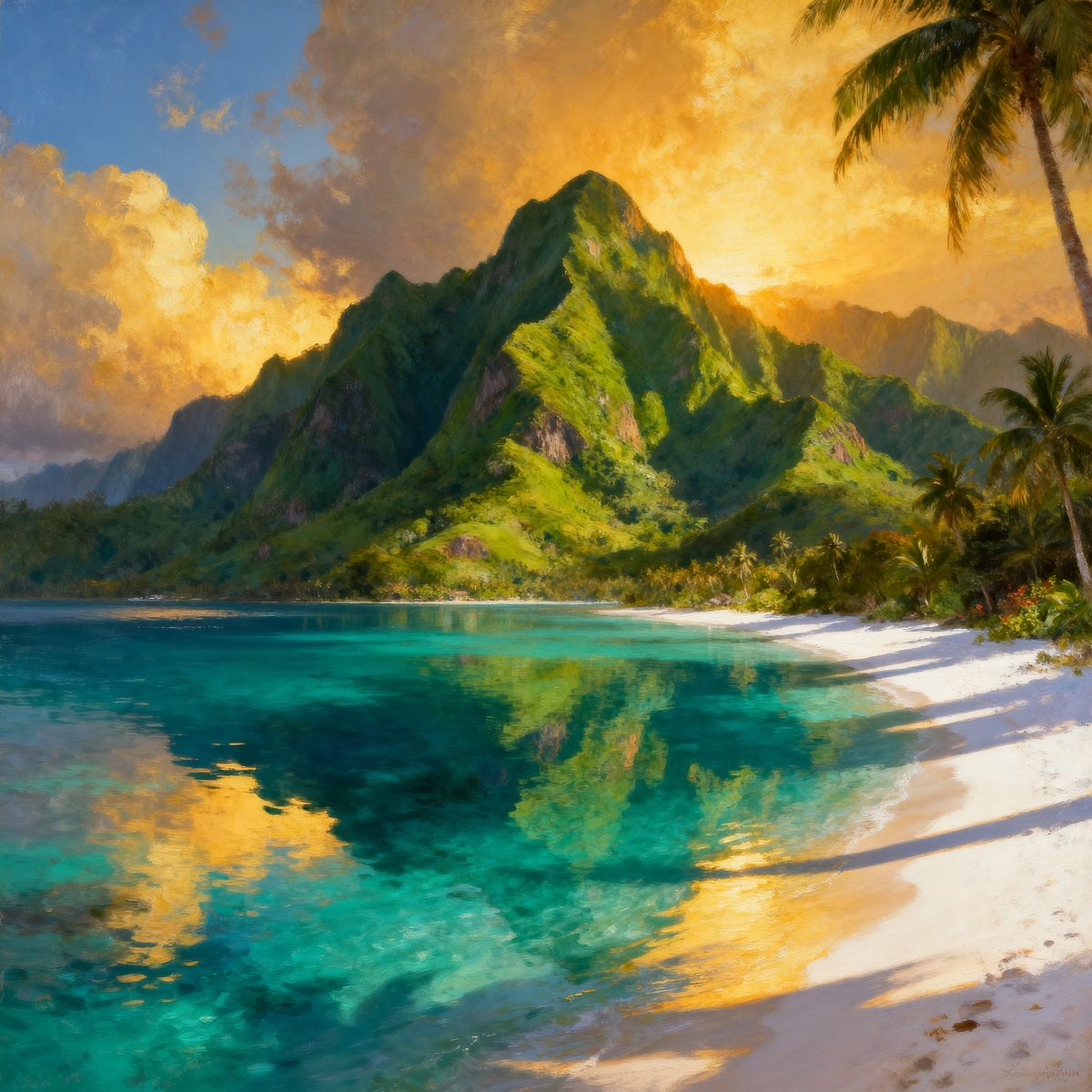 This image shows a breathtaking Polynesian lagoon with deep turquoise waters reflecting lush mountains and white sand beaches. Golden hour sunlight creates a dramatic, painterly effect in a highly detailed matte painting style.