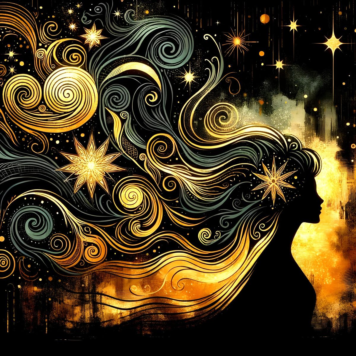 This image shows a minimalist, semi-abstract depiction of a goddess figure in burnished gold on a black canvas. Intricate swirling patterns form her hair, set against a backdrop of golden stars. The artwork uses high contrast and 3D shading techniques.
