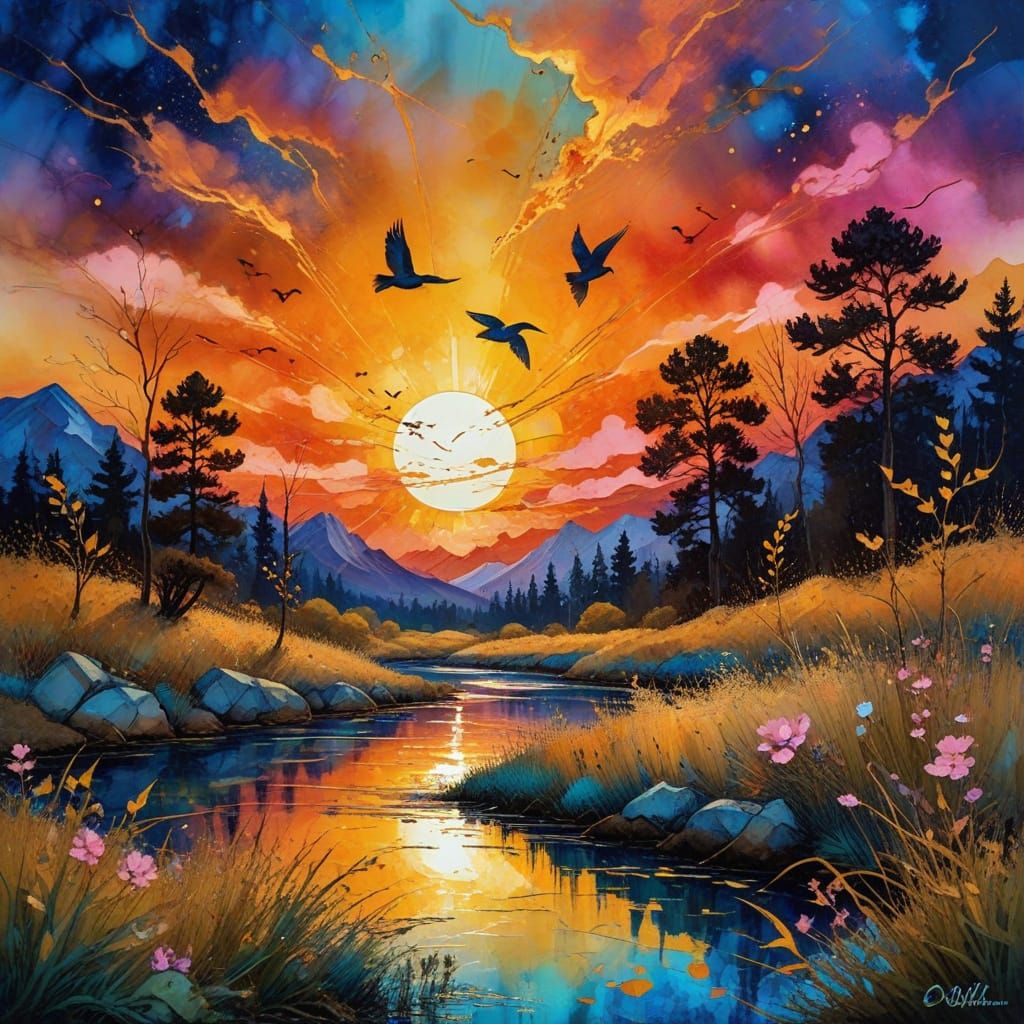 This image shows fluffy birds on river grass with a vibrant, recursive alcohol ink background. Features pastel hues, gold flecks, and a mysterious, glowing sunset mood. Rendered in an impressionist, impasto oil painting style.