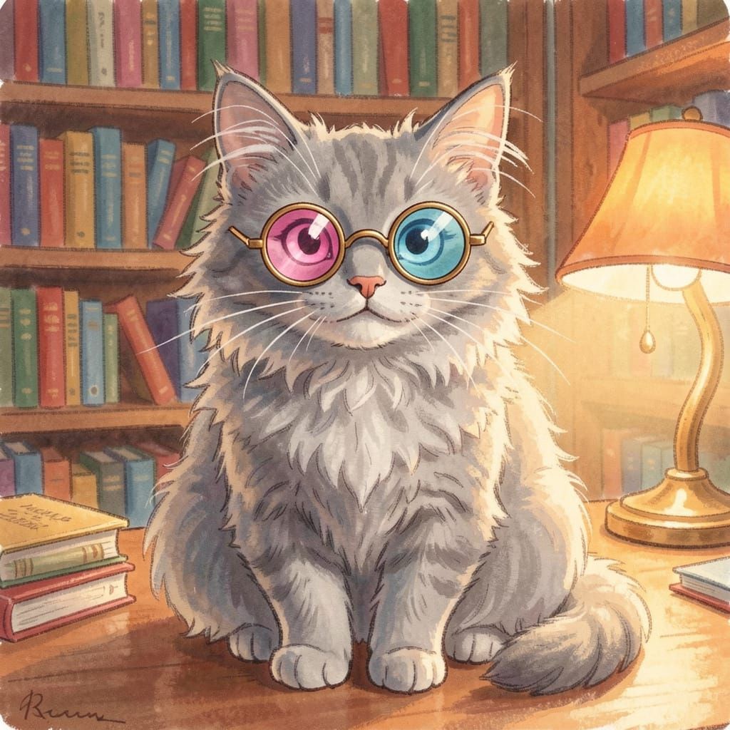 This image shows a fluffy grey cat wearing round spectacles, one pink and one blue. The scene is rendered in a whimsical, painterly style with soft textures and vibrant colors.