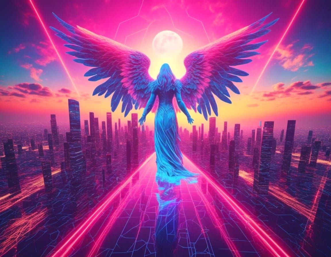 This image shows celestial figures amidst the Los Angeles cityscape, rendered in a retro wave aesthetic. The artwork blends divine imagery with a vibrant 80s-inspired style.