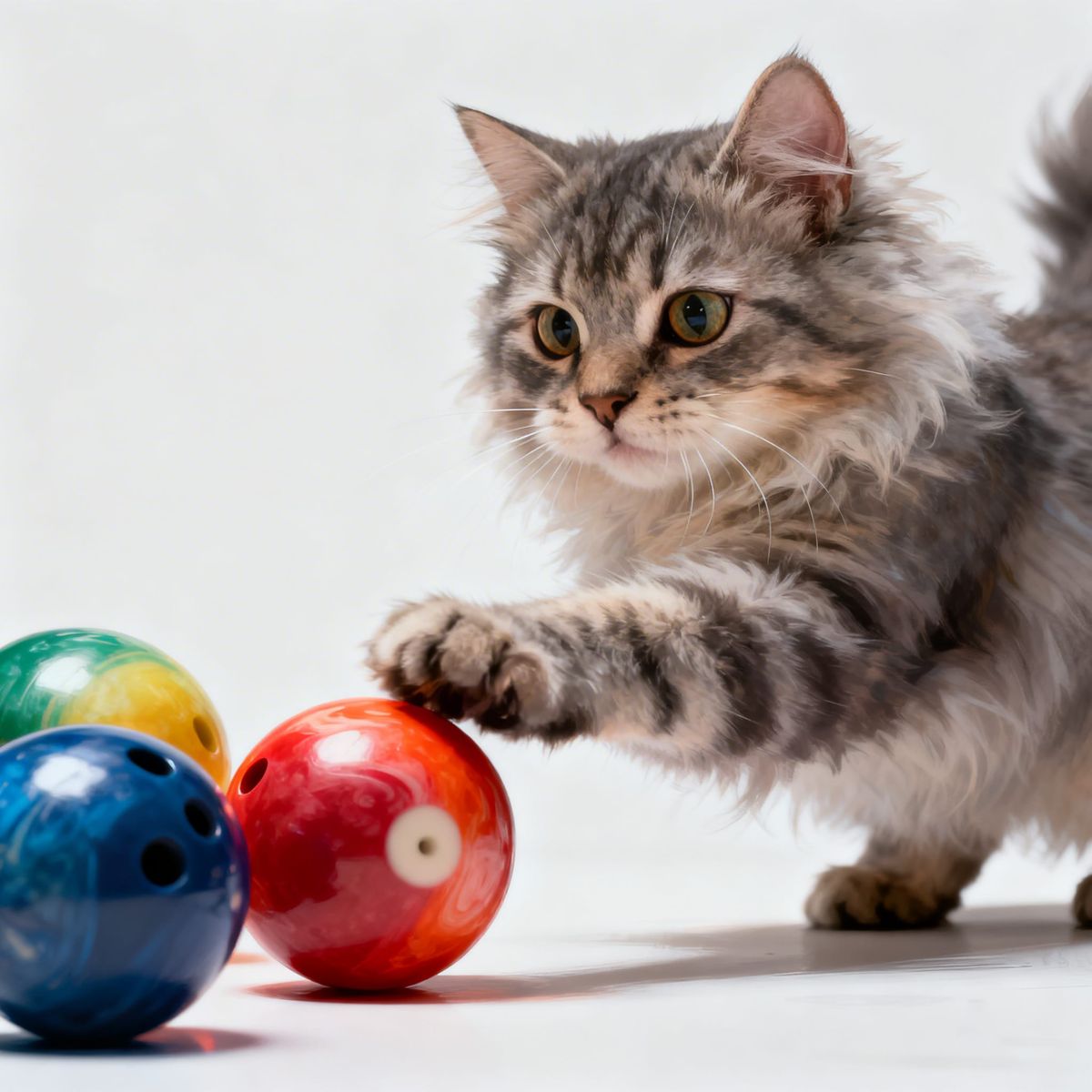 A cute, fluffy cat with expressive eyes playfully bats at colorful bowling balls. Soft, cinematic lighting highlights the cat's lively personality in this trendy, visually striking composition.