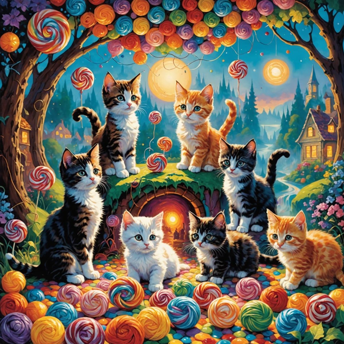 A group of adorable kittens playing with yarn that unravels into a portal to a whimsical candy land. Lollipops grow like trees, and rivers f...