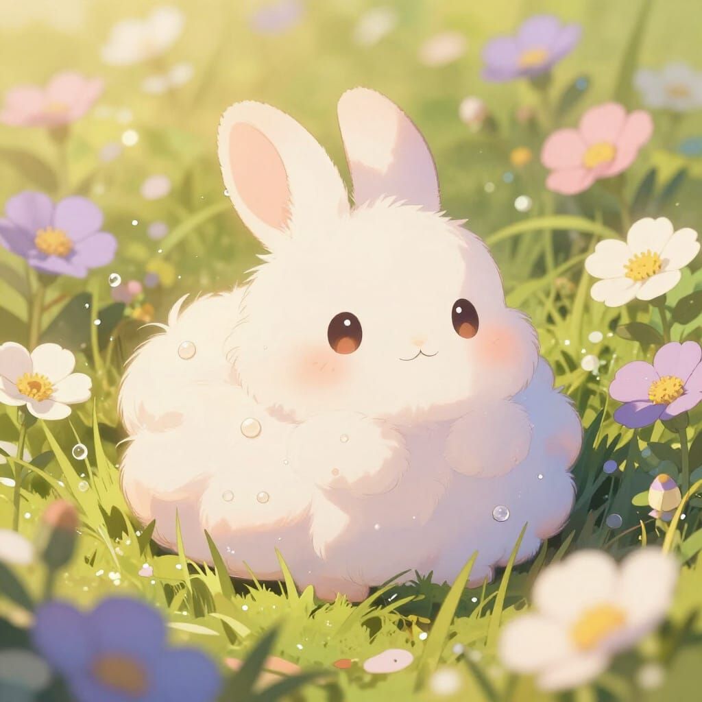 This image shows a tiny, soft creature like a cloud-rabbit in pastel colors, resting among large flowers. Rendered in a painterly anime style with vibrant colors.