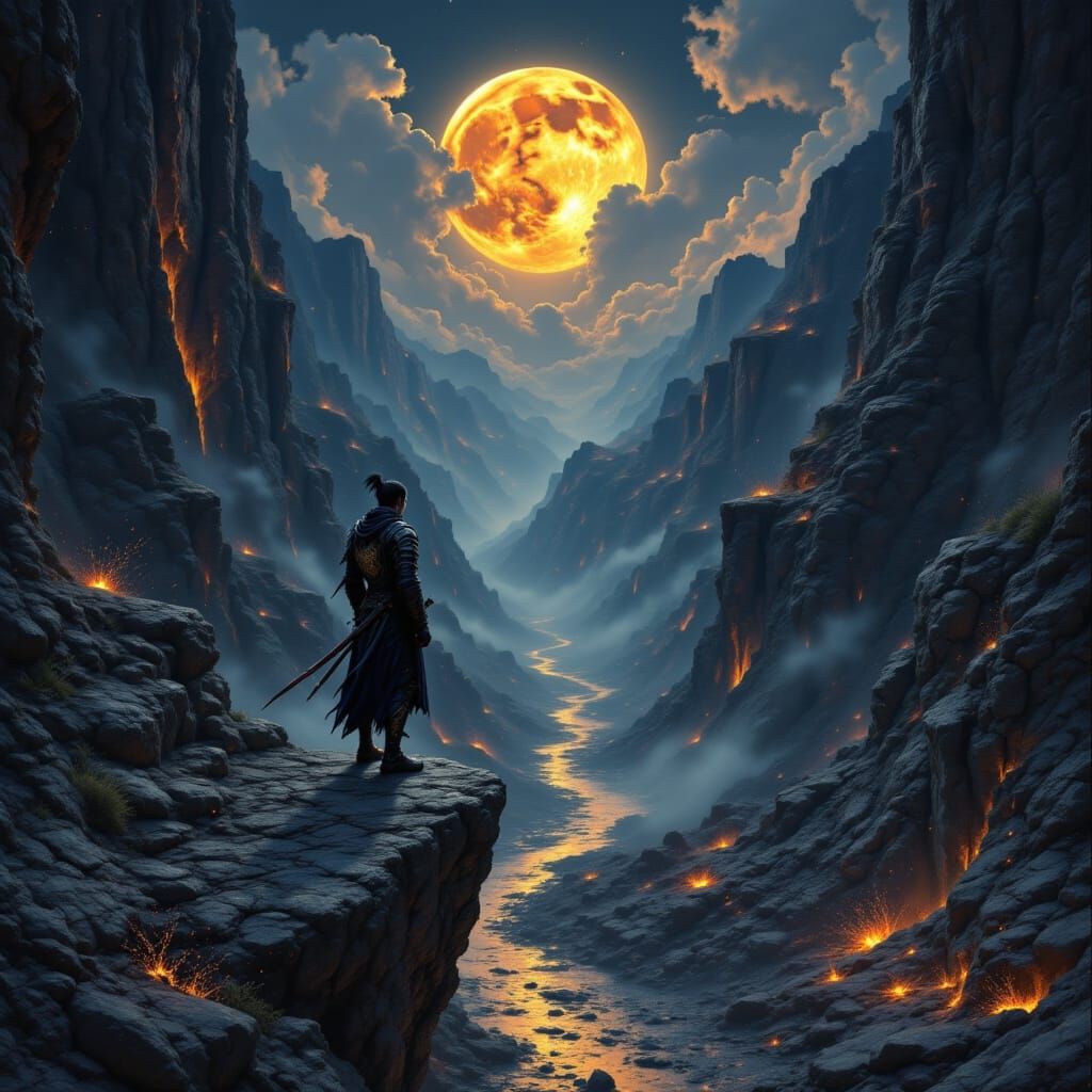 This image depicts a lone samurai in ornate dark fantasy armor standing on a cliff edge, gazing at a canyon with a molten gold river. The scene features a bruised indigo sky and is rendered in a detailed matte painting style with brooding textures.