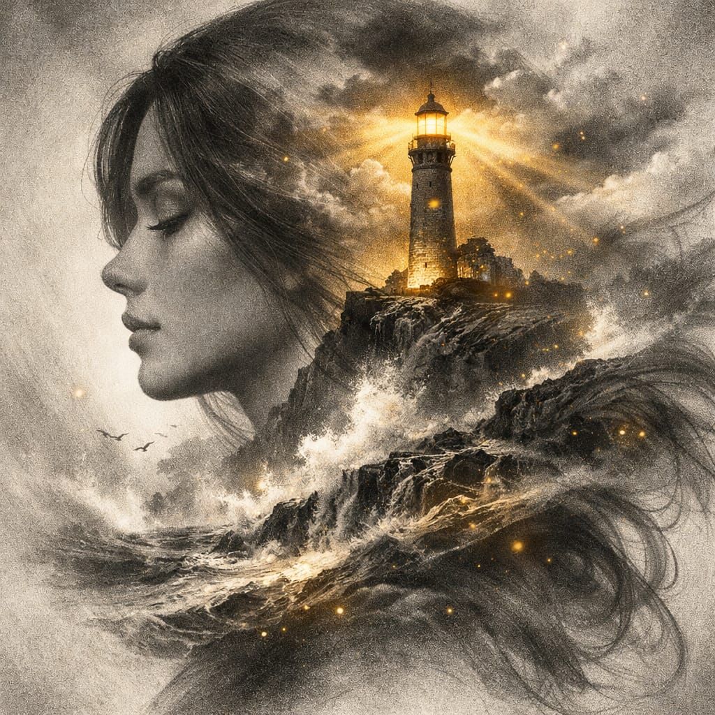 This image features a surreal double-exposure portrait blending a woman's profile with a dramatic coastline. A lighthouse shines through stormy skies, with waves crashing below, rendered in a fine-art aesthetic with sepia-gold accents.