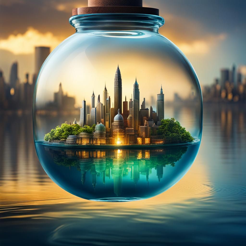 This image shows a city contained within a glass bottle, floating serenely on water. The scene evokes a sense of mystery and wonder, with the city appearing magical.