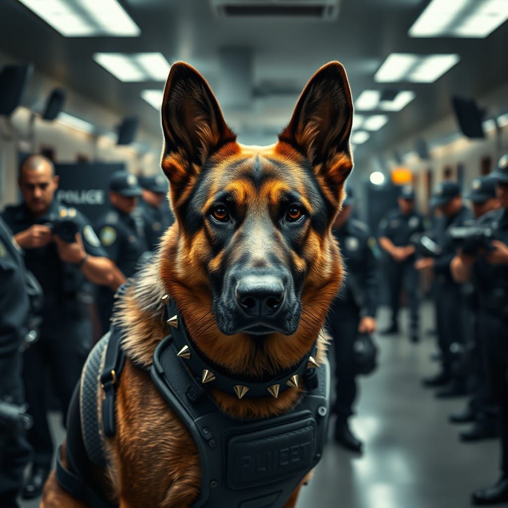 This image shows a fierce German Shepherd in tactical gear, standing alert in a busy police station. Photorealistic, wide-angle, with dramatic lighting and cinematic quality.