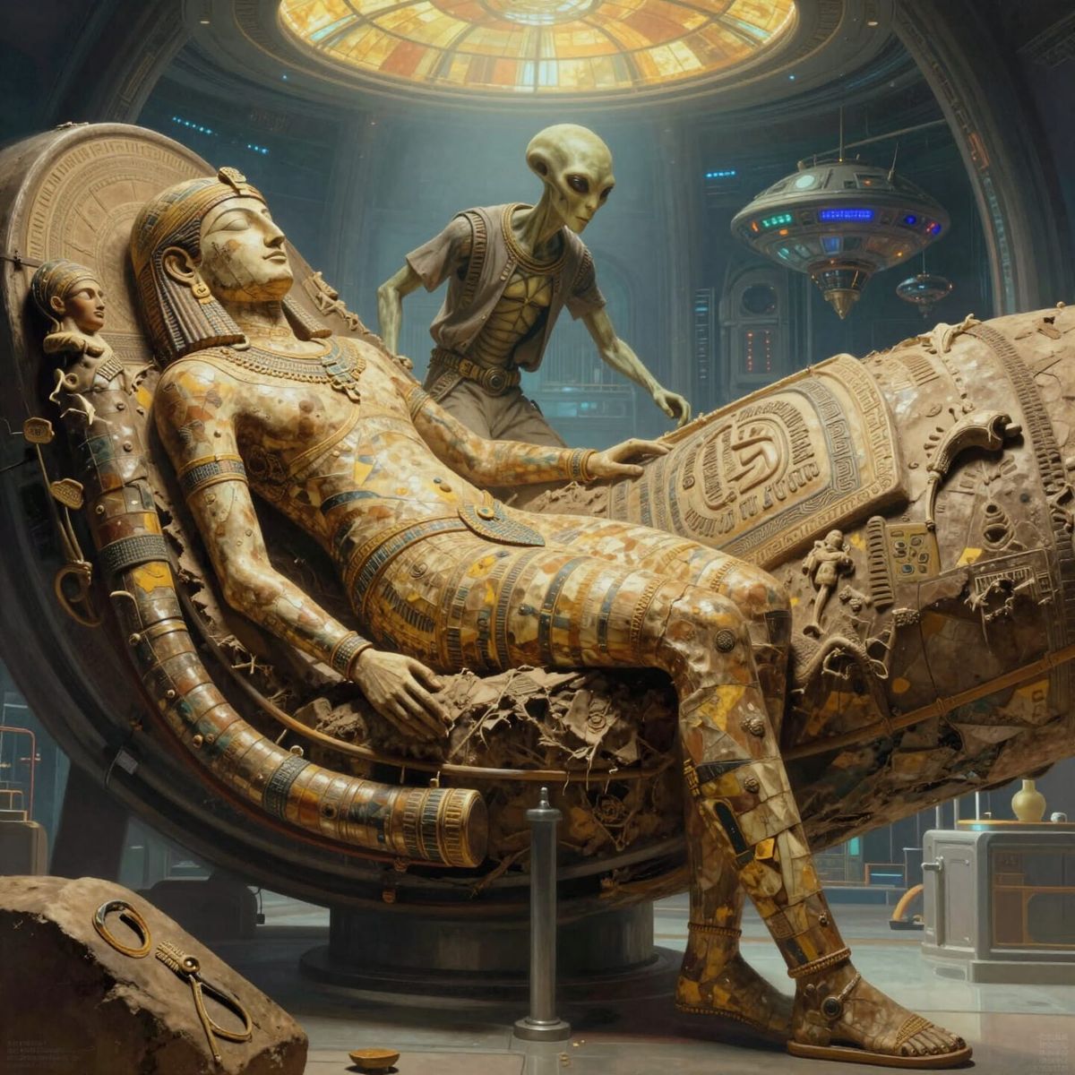 Scientists examining a gigantic old dry sleeping sumerian persian Kerman Achaemenid mummy in a futuristic high security lab,An alien guest casually walking through,behind is A colossal hangar filled with experimental alien spaceship technology,psychedelic,by Susan Seddon Boulet, h.r. giger vlaho bukovac, ...