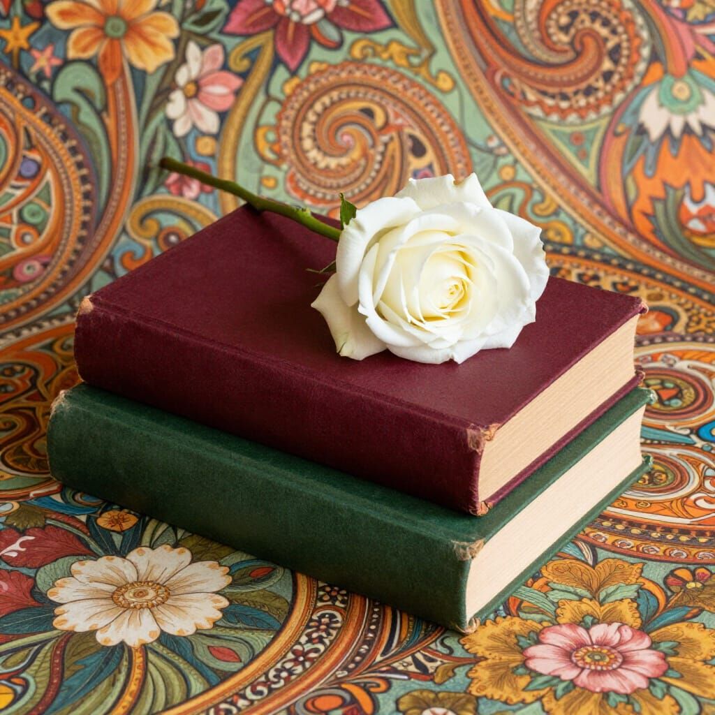 This image features two vintage stacked books, one burgundy and one green, with a white rose. The background boasts vibrant Liberty floral patterns, rendered in an Art Nouveau illustrative style.