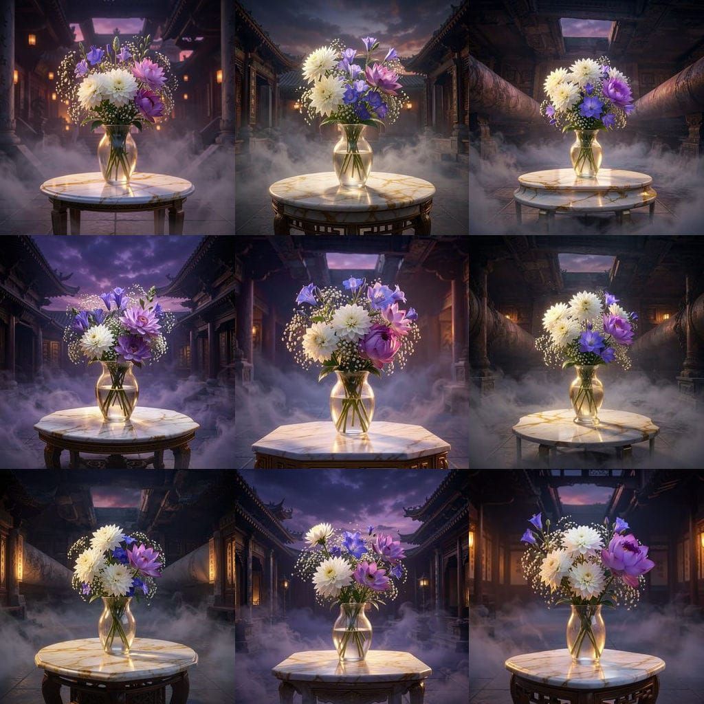 This image depicts a translucent vase filled with white asters, gentians, baby's breath, and a purple lotus. It rests on a marble table within an ancient Chinese cultivator sect under a dusky, misty sky. Rendered as a maximalist digital matte painting.
