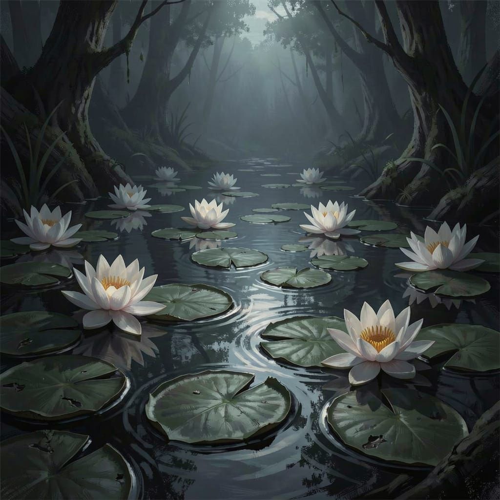 This image shows delicate water lilies floating on a calm pond, with soft ripples and natural reflections. It is rendered in a dark fantasy art style with dramatic lighting, evoking a sinister atmosphere.