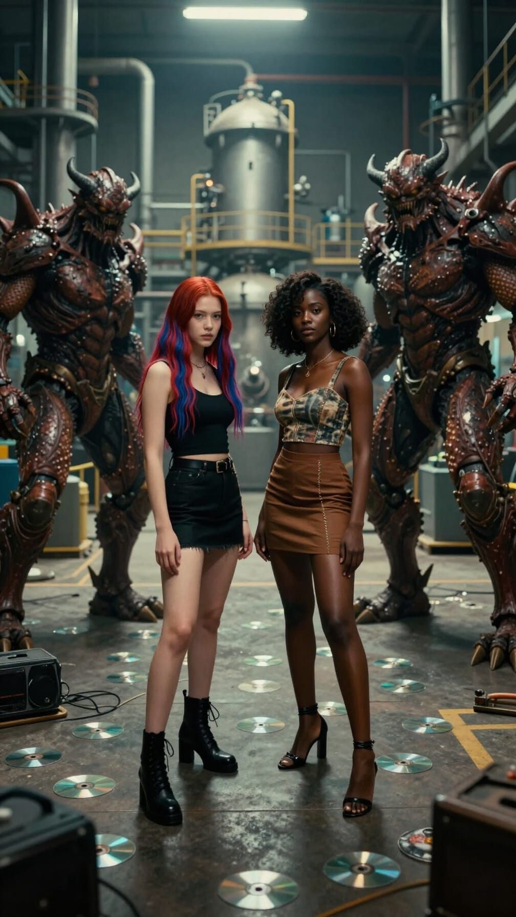 This image shows two women in a chemical factory, one with striped hair and the other Black, standing with giant furies. CDs are scattered on the floor. Cinematic, atmospheric, and masterfully lit.