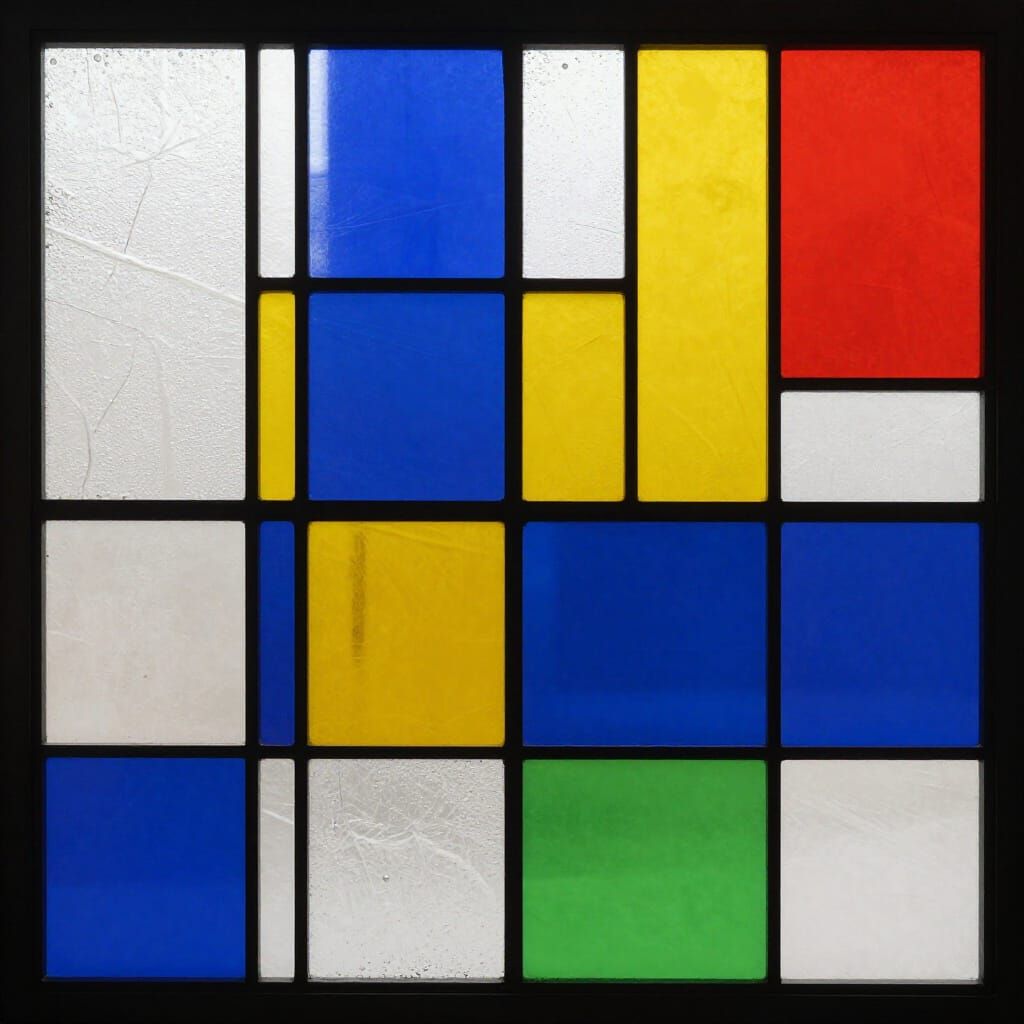 This image showcases a geometric glass panel with alternating smooth and seeded glass panes in primary colors. Thin black leading frames the abstract composition, emphasizing light refraction.