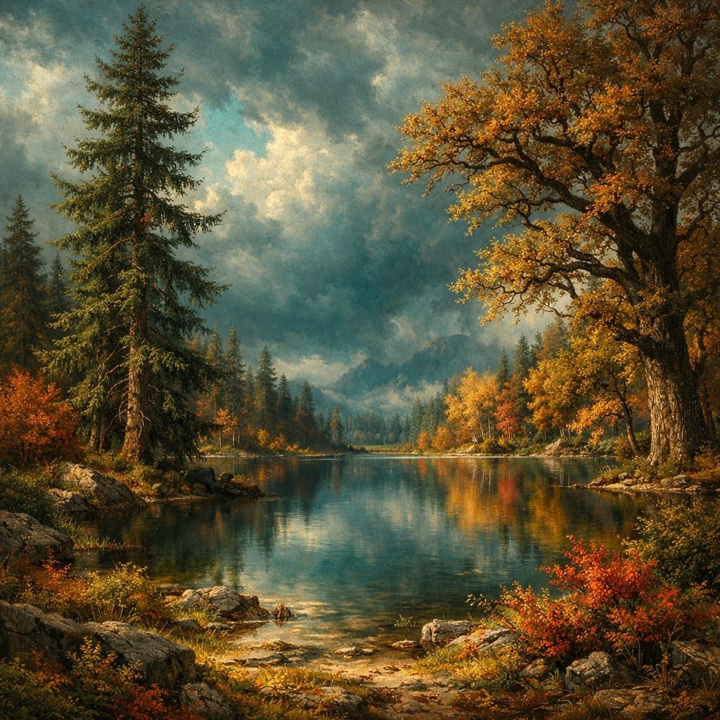 This image depicts a quiet autumn forest and a clear lake under a stormy, turquoise sky. Rendered with intricate detail, it evokes the atmospheric depth of Renaissance landscape paintings.