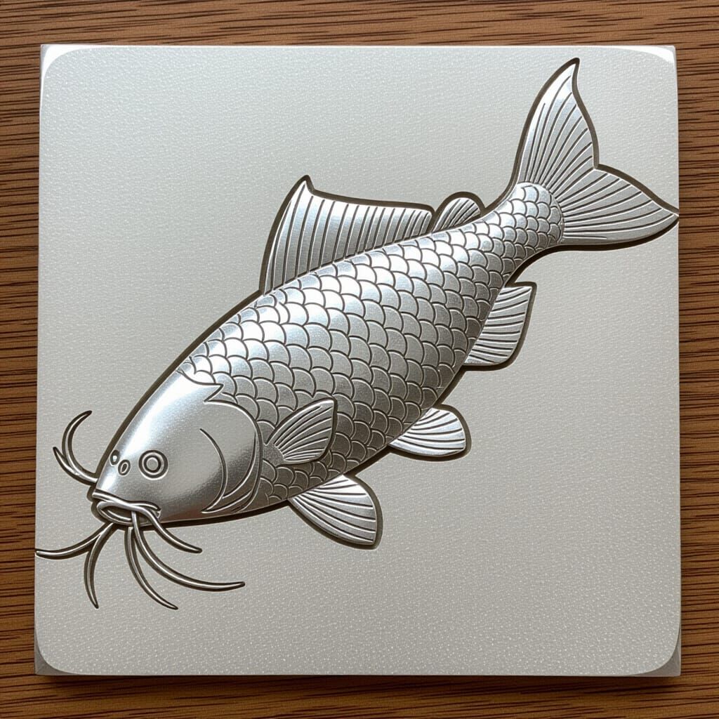This image showcases a finely detailed catfish sculpture meticulously carved from polished silver, highlighting its scales and form in a gleaming metallic finish.