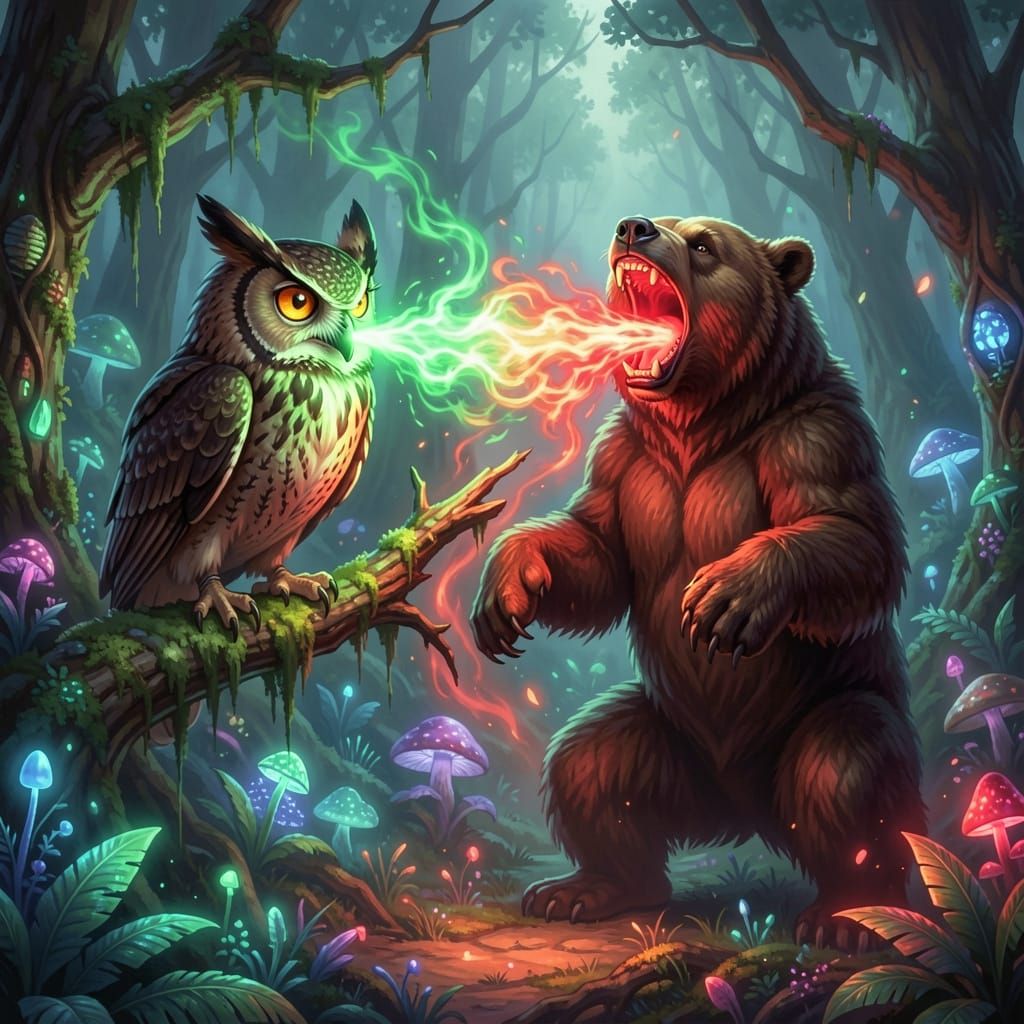 This image shows a mystical forest with a majestic owl breathing green fire and a powerful bear spewing red flames. Features dramatic lighting and vibrant colors in a fantasy concept art style.