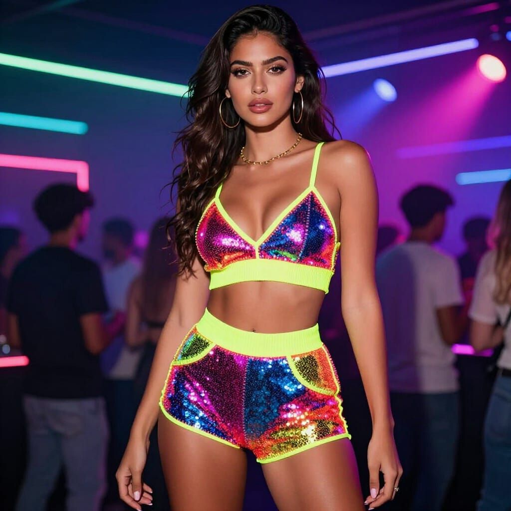 This image captures a woman in a dazzling, sequined club outfit with neon details, photographed with sharp focus and a shallow depth of field. It evokes the vibrant energy of nightlife through dynamic lighting.