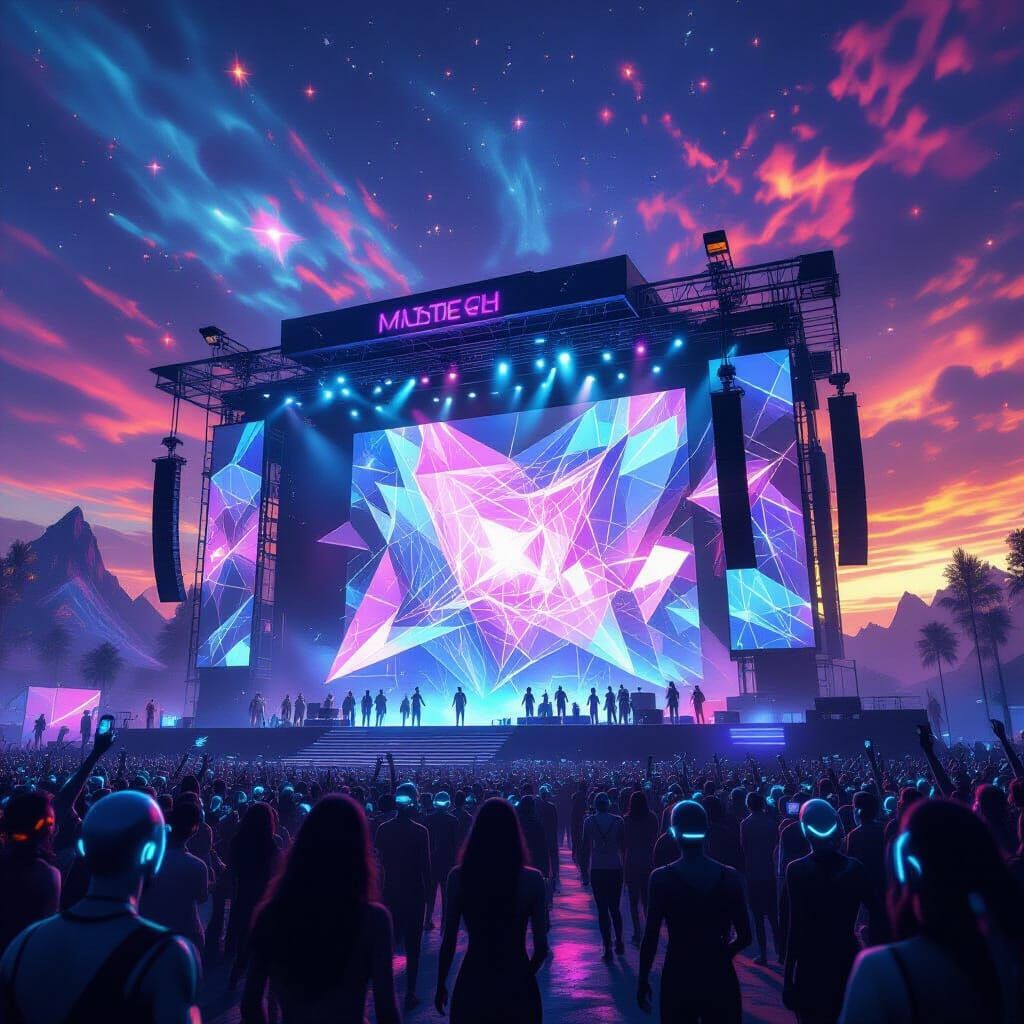 Generate unique music festival and holographic stage images with our free AI generator. Easy and fun!