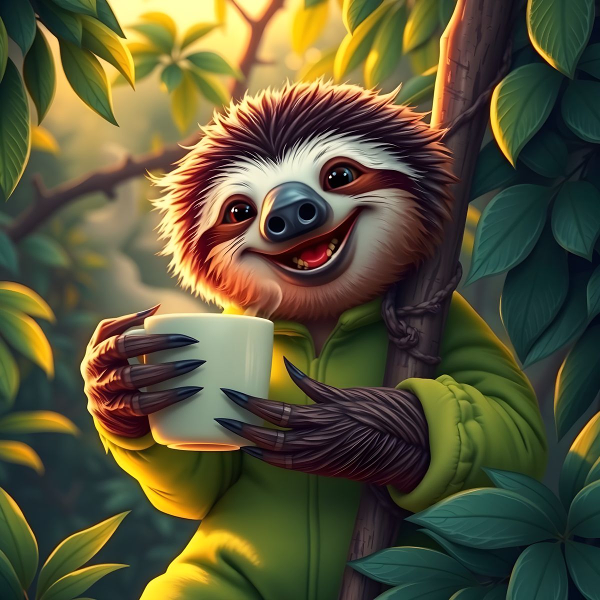 This image shows a sloth with a joyful expression, grasping a coffee cup as if it were a tree branch. The artwork blends realistic style with a whimsical touch, creating a unique scene.