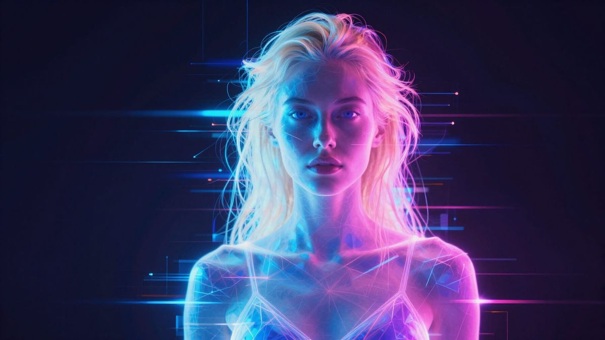 This vibrant digital artwork shows a blonde woman illuminated by neon light, presented in a futuristic x-ray style with geometric patterns and light streaks.