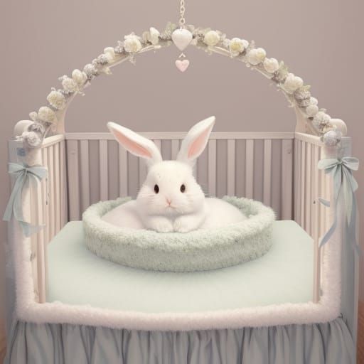 A whimsical illustration of a baby rabbit drinking from a bottle in a crib. The image features pastel and warm colors, soft lighting, fluffy textures, and gentle lines, creating a cozy and peaceful nursery scene.