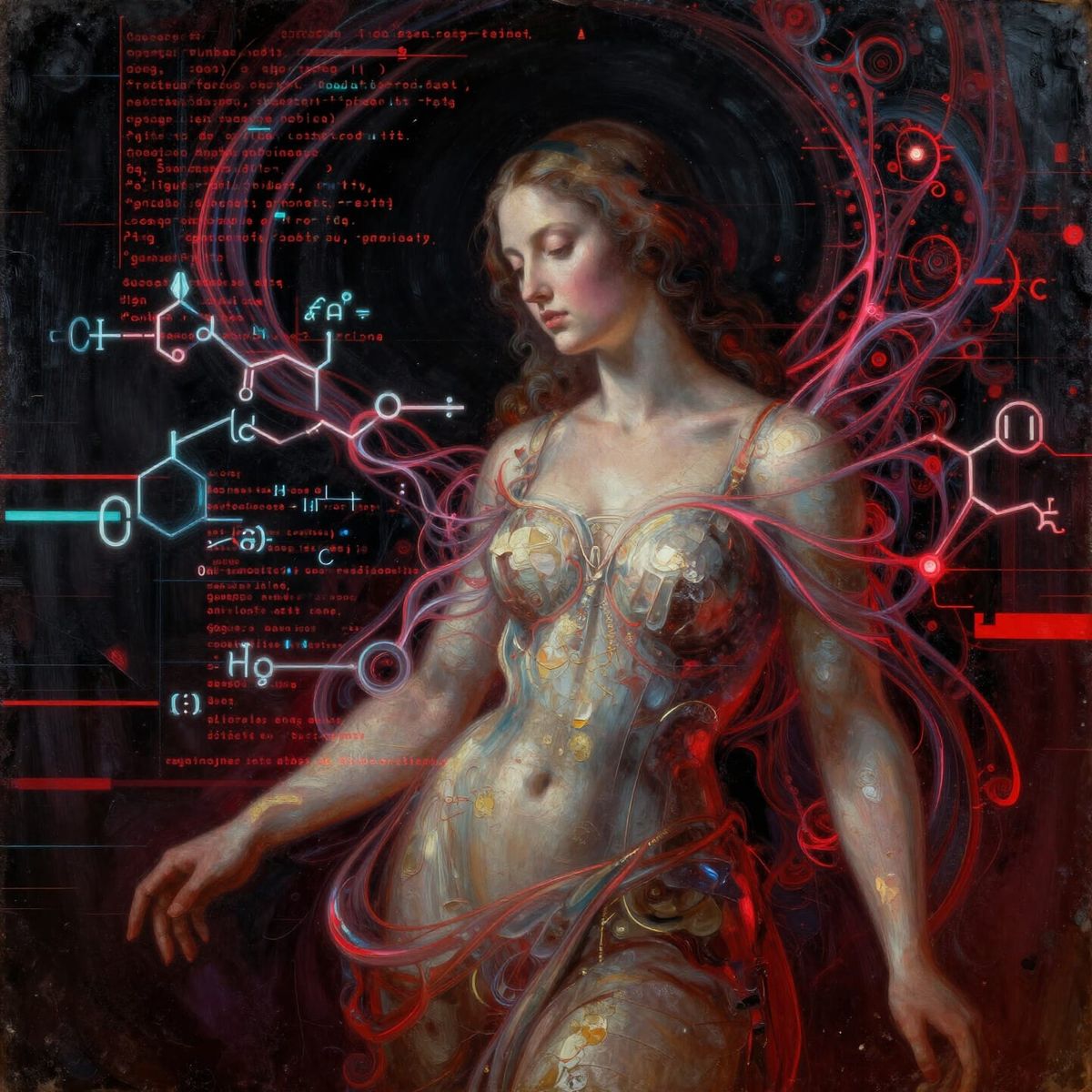This image depicts a woman formed from code, presented as an impasto oil painting with craquelure and aged varnish. A dramatic neon background with glitch effects complements ethereal equations and fractal patterns.