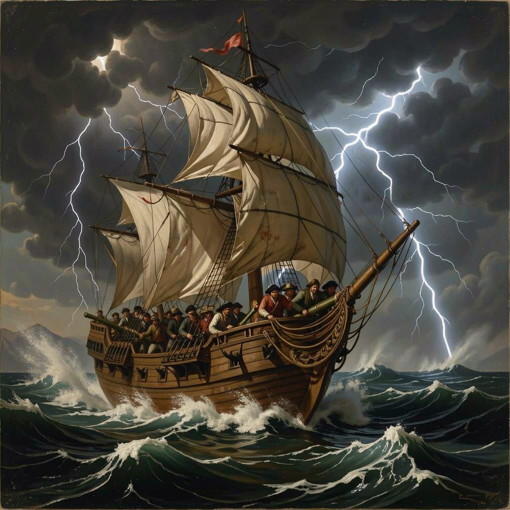 A dramatic Baroque painting depicts a pirate ship battling a fierce storm. Lightning illuminates the crew as they navigate chaotic seas in a moody, desaturated palette.